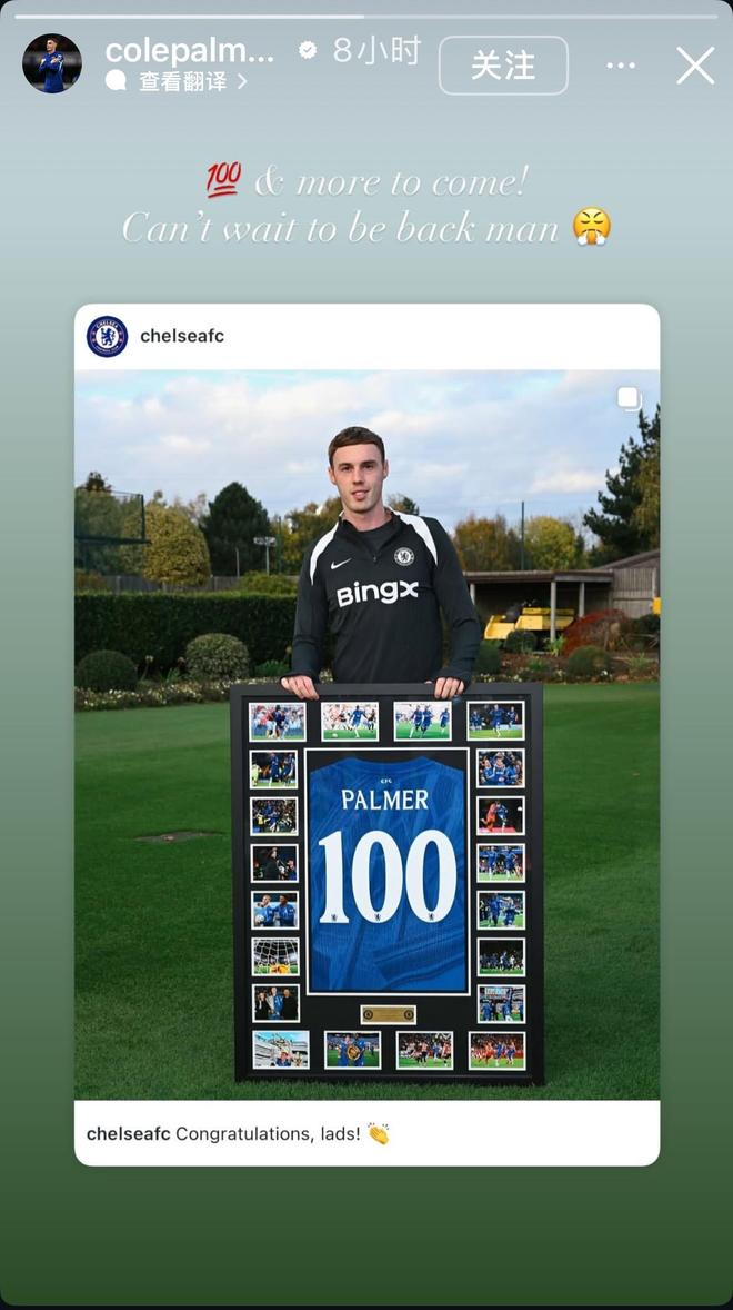 雷速体育10月29日讯 今日,切尔西球星帕尔默在社交软件上晒出自己的切尔西百场纪念球衣。并感叹道:“还会有更多,迫不及待想回归了!”
